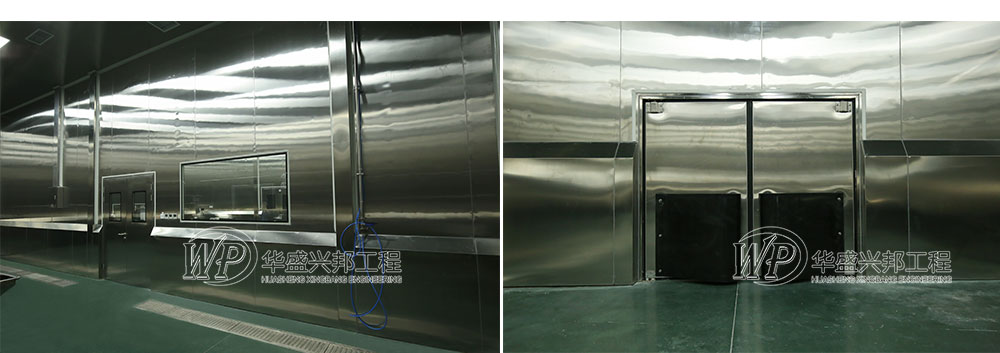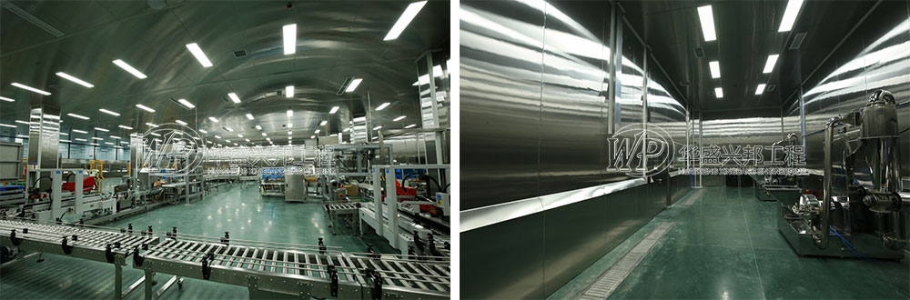 其中,車間墻面均采用雙面不銹鋼中空玻鎂板,A1級防火板材。便于車間沖洗,防潮,防水,耐腐蝕。吊頂也是不銹鋼板材,整個車間猶如“鐵桶”一般。