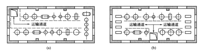 3、凡通過樓層的設備應在樓面的適當位置設置吊裝孔。當制藥廠廠房較短時,吊裝孔可設在制藥廠廠房的一端,如圖1(a)所示;當廠房較長(>36m)時,吊裝孔應設在制藥廠廠房的中央,如圖1(b)所示。多層樓面的吊裝孔應在每一樓層相同的平面位置設置,并在底層吊裝孔附近設一大門,以便需吊裝的設備能夠順利進出。