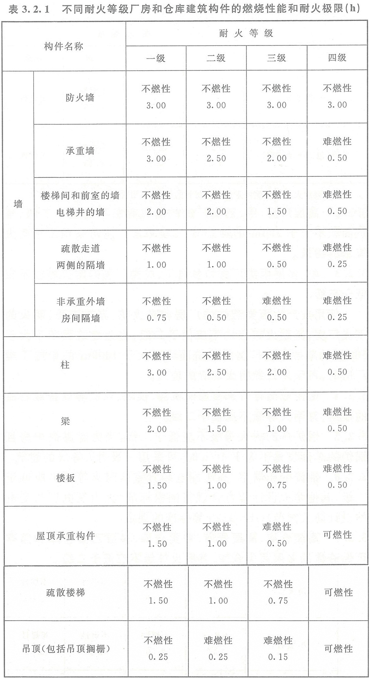 3.2.1廠房和倉庫的耐火等級可分為一、二、三、四級,相應建筑構件的燃燒性能和耐火極限,除本規(guī)范另有規(guī)定外,不應低于表3.2.1的規(guī)定。