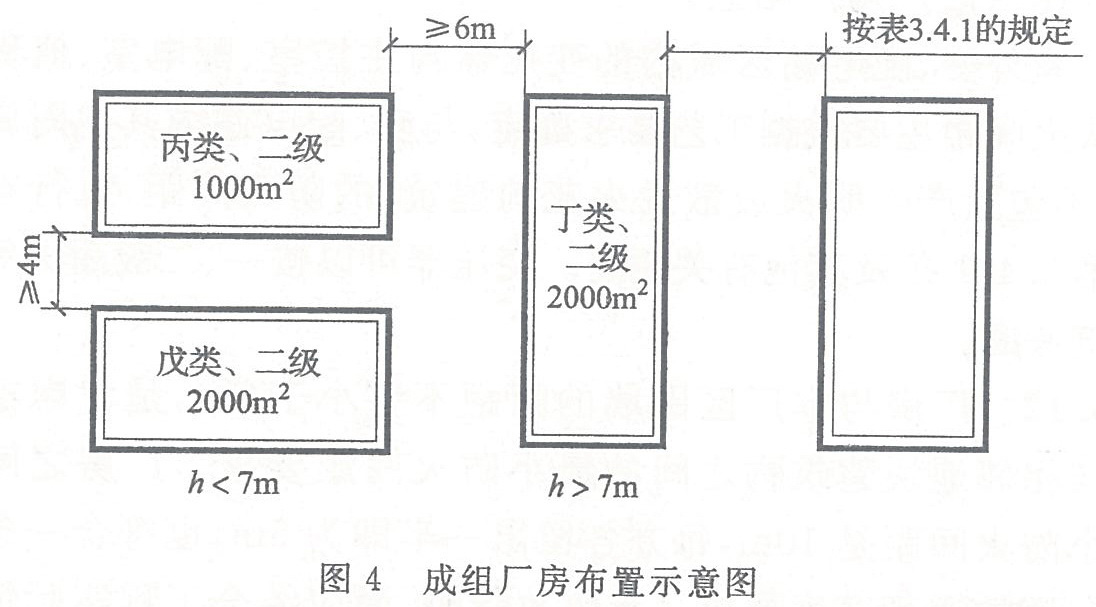 3.4.8 除高層廠房和甲類廠房外,其他類別的數(shù)座廠房占地面積之和小于本規(guī)范第3.3.1條規(guī)定的防火分區(qū)最大允許建筑面積(按其中較小者確定,但防火分區(qū)的最大允許建筑面積不限者,不應(yīng)大于10000m2)時(shí),可成組布置。當(dāng)廠房建筑高度不大于7m時(shí),組內(nèi)廠房之間的防火間距不應(yīng)小于4m;當(dāng)廠房建筑高度大于7m時(shí),組內(nèi)廠房之間的防火間距不應(yīng)小于6m。