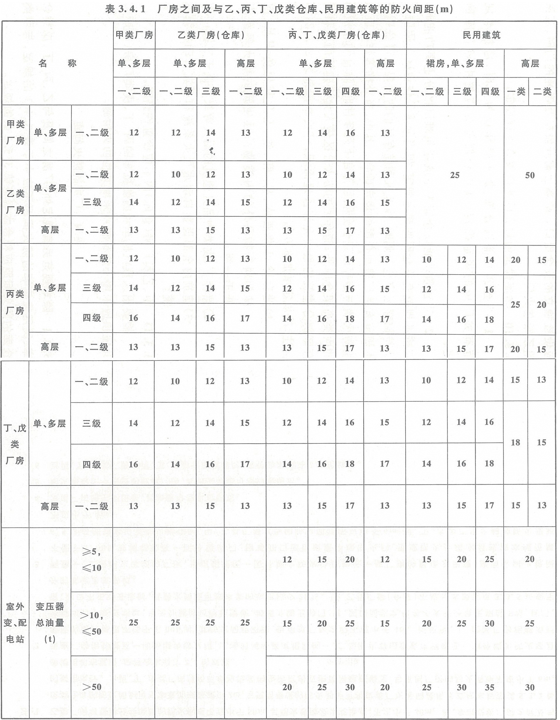 3.4.1 除本規(guī)范另有規(guī)定外,廠房之間及與乙、丙、丁、戊類倉(cāng)庫(kù)、民用建筑等的防火間距不應(yīng)小于表3.4.1的規(guī)定,與甲類倉(cāng)庫(kù)的防火間距應(yīng)符合本規(guī)范第3.5.1條的規(guī)定。