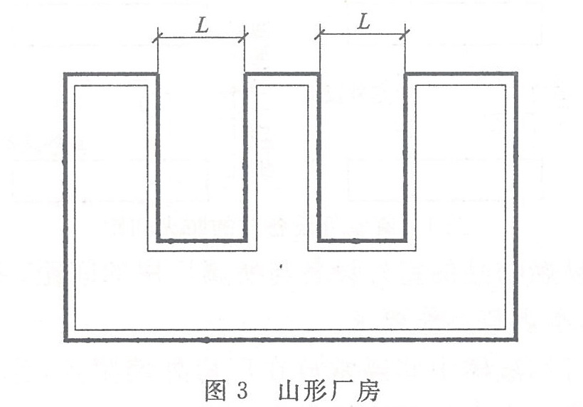 3.4.7 對(duì)于圖3所示的“山形”、“凵形”等類似形狀的廠房,建筑的兩翼相當(dāng)于兩座廠房。本條規(guī)定了建筑兩翼之間的防火間距(L),主要為便于滅火救援和控制火勢(shì)蔓延。但整個(gè)廠房的占地面積不大于本規(guī)范第3.3.1條規(guī)定的一個(gè)防火分區(qū)允許最大建筑面積時(shí),該間距L可以減小到6m。