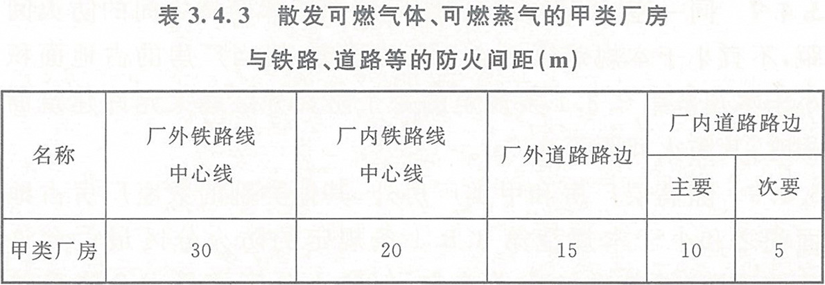 3.4.3 散發(fā)可燃?xì)怏w、可燃蒸氣的甲類廠房與鐵路、道路等的防火間距不應(yīng)小于表3.4.3的規(guī)定,但甲類廠房所屬?gòu)S內(nèi)鐵路裝卸線當(dāng)有安全措施時(shí),防火間距不受表3.4.3規(guī)定的限制。